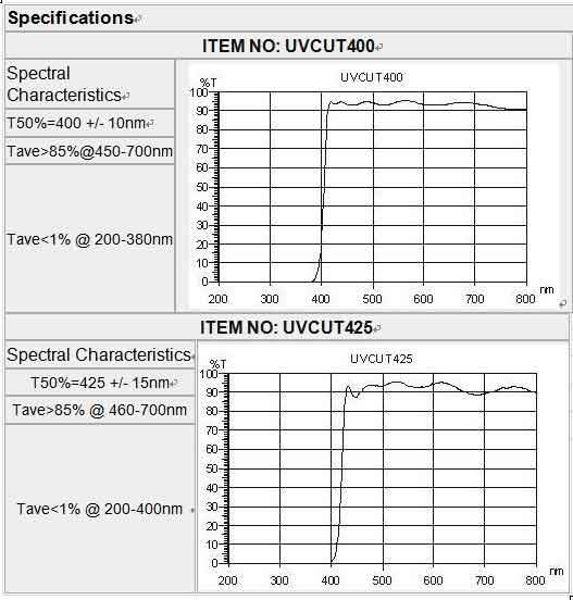 UV Cut filter can reflect or absorb UV light(wavelength) while visible light high transmittance. They are always used in the fields of Lighting,Optical Equipments,Museum Lighting,Filters for Photography,etc